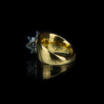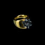 This solid heavy ring with its asymmetrical design and intricate handmade sharp lotus flower on top brings out a natural bold appearance. The piece is made in yellow gold vermeil on sterling silver. The flower is in black rhodium vermeil on sterling silver.